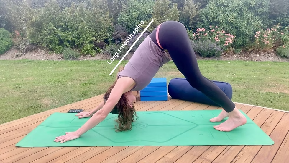 For many people, bending the knees a little actually improves Downward Dog. It allows the pelvis to tip more freely and helps the spine lengthen with less strain. Once the back feels long and supported, the legs can gradually work toward more extension over time.
